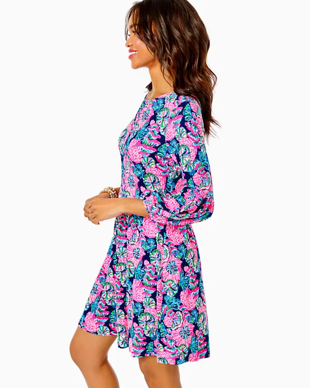 Blouson sleeves add statement volume to our brightly printed Auralia Dress. This jersey style features a fit-and-flare silhouette and classic crew neckline.