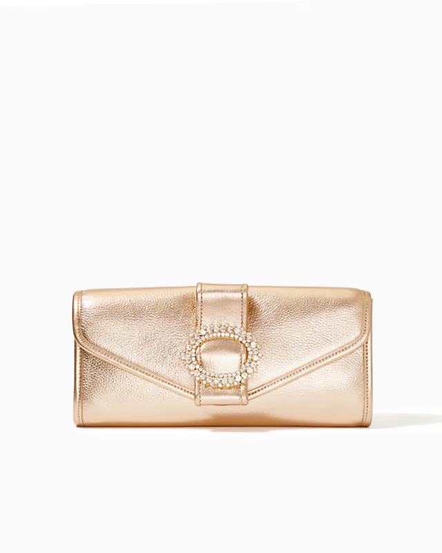 A glittering embellished buckle tops off the Benton Clutch, a chic design in golden leather with a detachable gold chain strap.