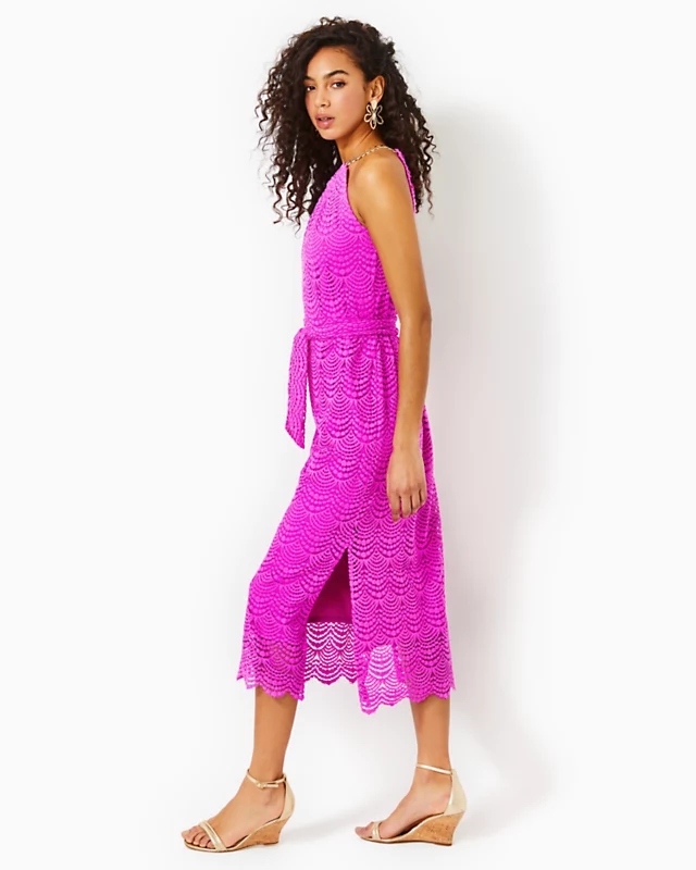 Made from scalloped shell lace for delightful detail, the Bingham Midi Dress is a summer social standout. This easy fit halter dress features a back keyhole, side slits, a separate sash at the waist, and a charmingly scalloped hem.