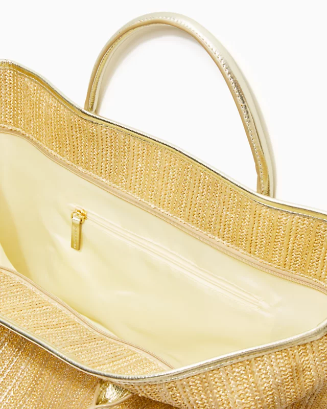 - Metallic straw tote with zipper closure and hanging fringed pineapple tassel.