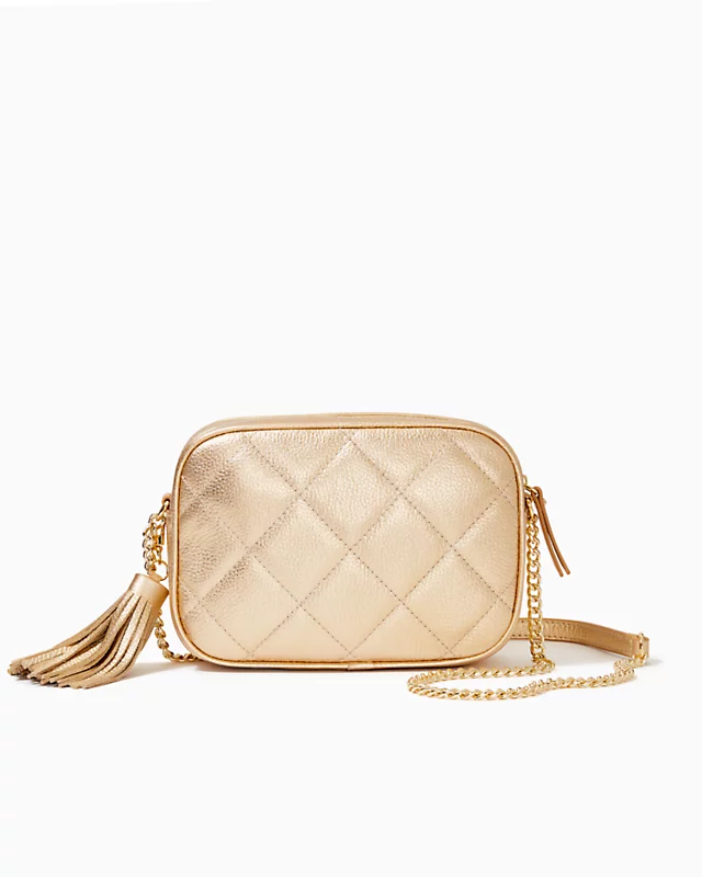 - Quilted gold shrunken crossbody with a gold metal chain.