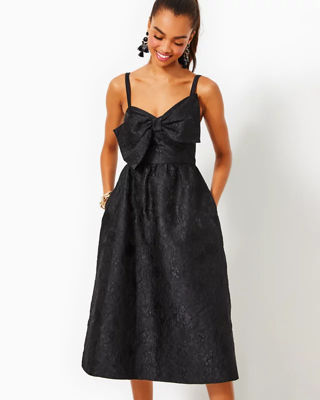Textural jacquard and a dramatic bow detail at the bodice make the Ellara Dress our most elegant special occasion look. This fit-and-flare midi features a strappy sweetheart bodice, a smocked back, and side seam pockets.