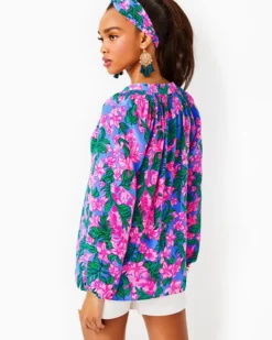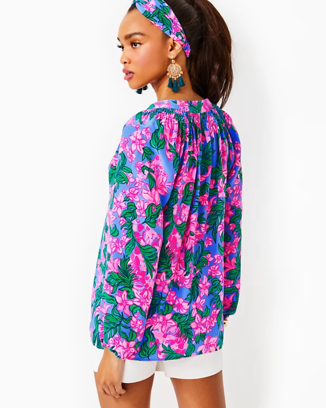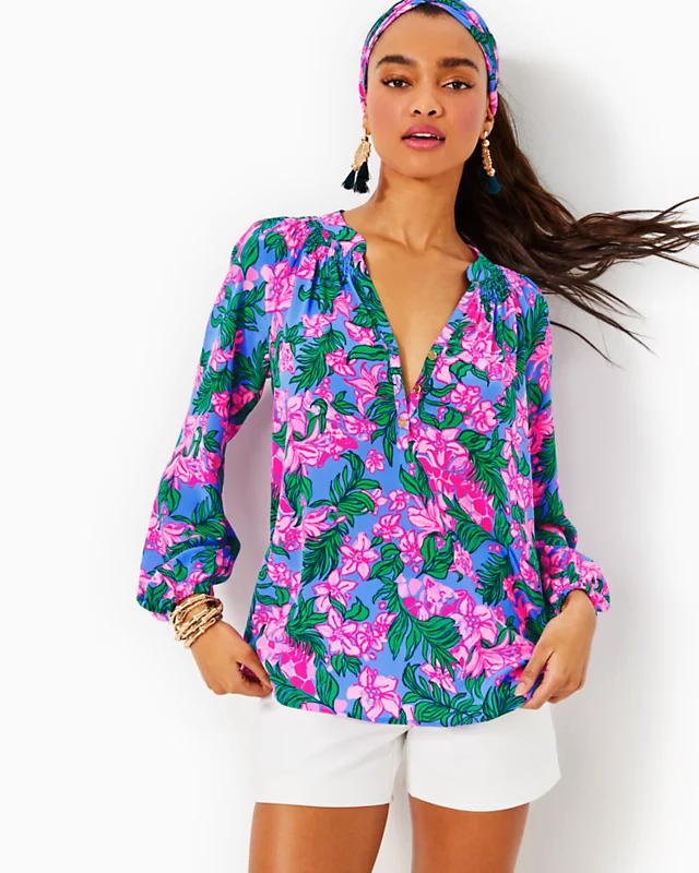 A tried-and-true wardrobe staple, our Elsa Silk Top can be dressed up or down. The Elsa has become a Lilly favorite thanks to its loose-fitting body, beautifully smocked neckline, and signature gold buttons at the placket. Pair with jeans, leggings, shorts, or a skirt to make this elegant pullover top your own.