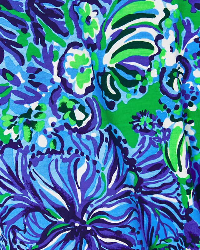 Soft and vibrant in printed cotton jersey, the Fairfax Dress is a straight fit style with a notch neckline, pintuck details, and 3/4-length roll-tab sleeves finished with gold buttons.