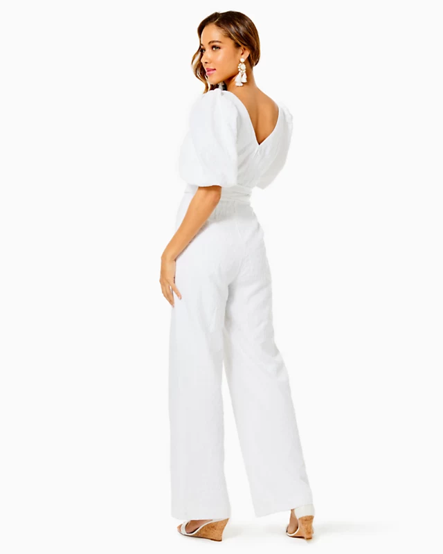 - Bra-friendly, full length, V-neck jumpsuit with elbow-length puff sleeves and a removeable sash.