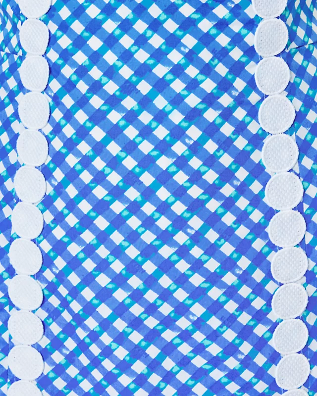 A charming check pattern tops off our cotton poplin Lawless Romper, a strappy style with a skort bottom and delicate lace trim.