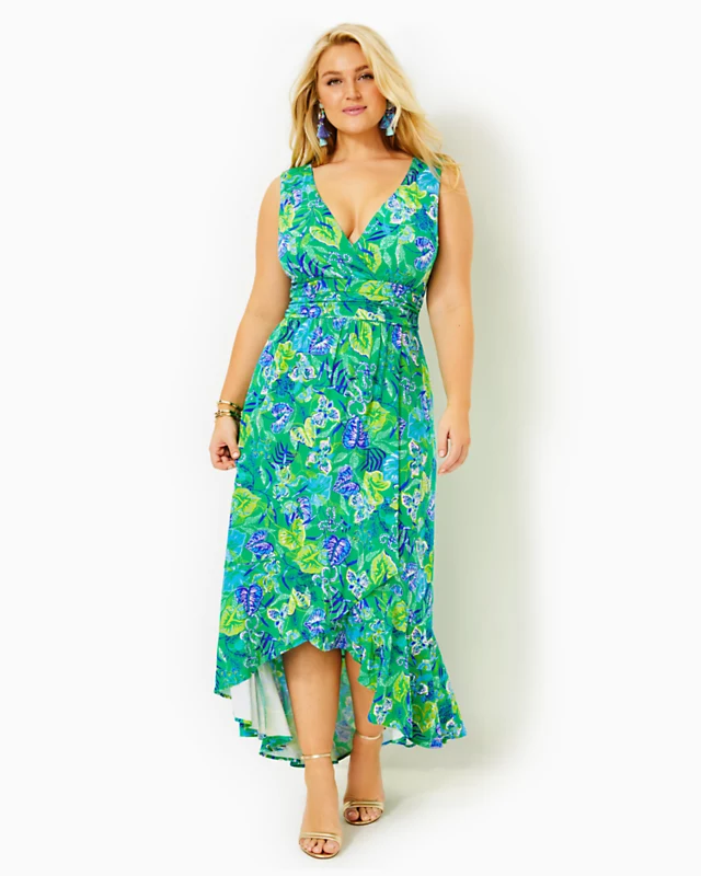 One word for the Moana Maxi Dress? Magical. This fit-and-flare beauty balances ease and elegance with jersey construction and a flounced high-low skirt. Faux wrap styling and a ruched waistband create a flattering silhouette, while an ankle-length hemline lets you move wherever summer nights take you.