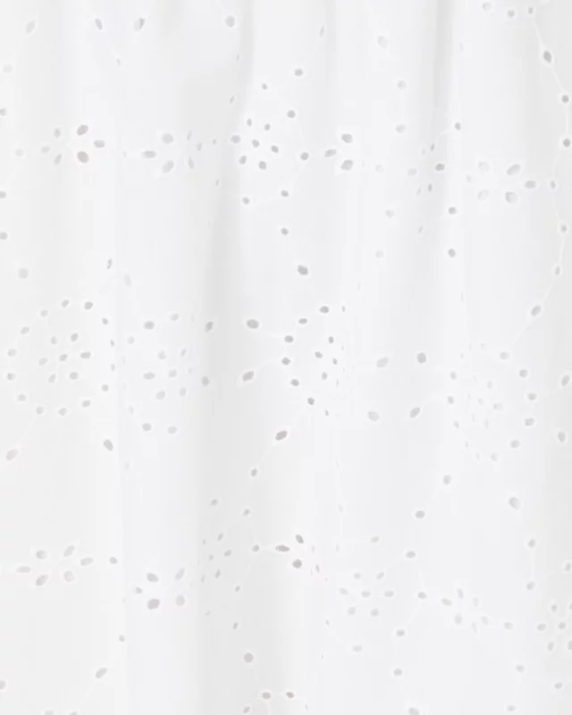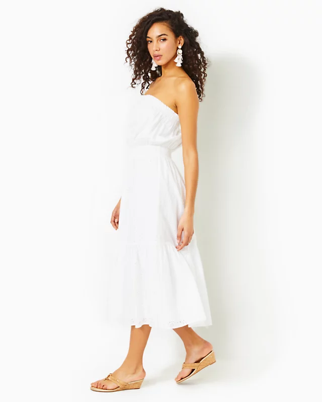 Airy white eyelet makes the Nikole Dress a summertime staple, whether you’re heading to the beach or to dinner al fresco. This strapless midi offers an easy fit with smocking at the neckline and waist, plus a tall ruffle hem.