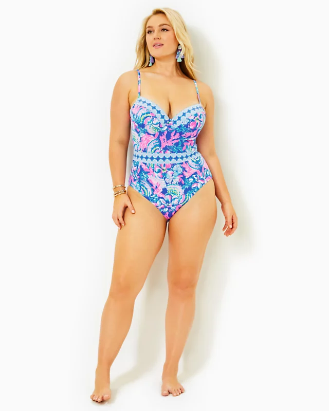 Thanks to print mixing at the neckline and waist, our Palma One-Piece Swimsuit is a seaside showstopper. Molded underwire cups, adjustable straps, and thoughtfully placed seaming round out this ultra-flattering style.