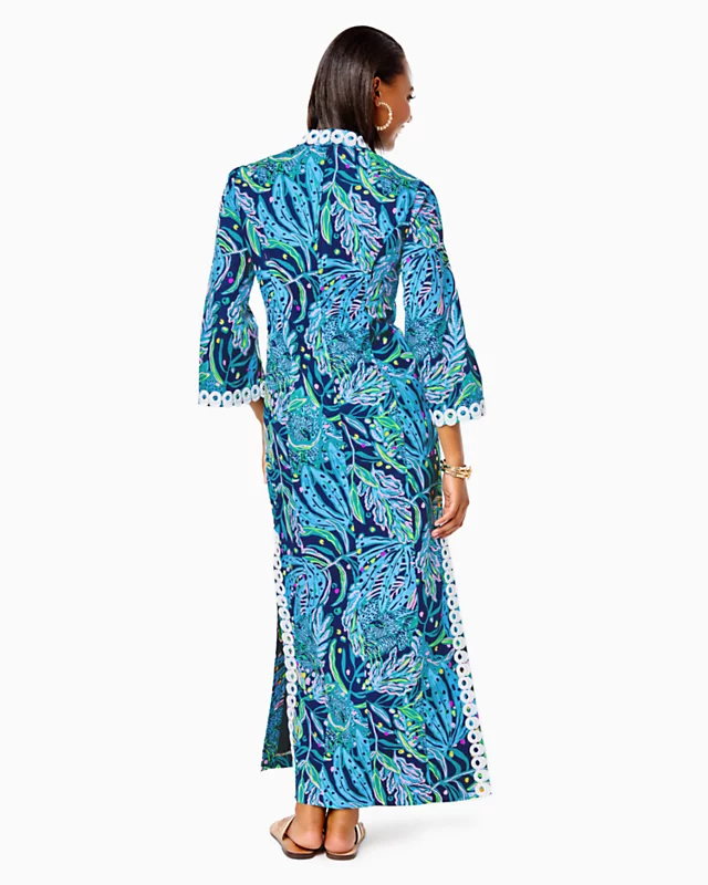 A classic style for any getaway, the Shealyn Caftan is a chic, straight-fit maxi in printed cotton poplin. This statement style features a stand collar, zip front neckline, bell sleeves, and side slits in the ankle-length skirt. A gold bamboo zipper pull and Lilly lace trim round out this resort essential.