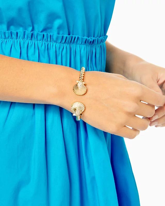Add a beachy twist to any ensemble with this hinged bracelet, which features a pair of golden seashells and sparkling pave accents.
