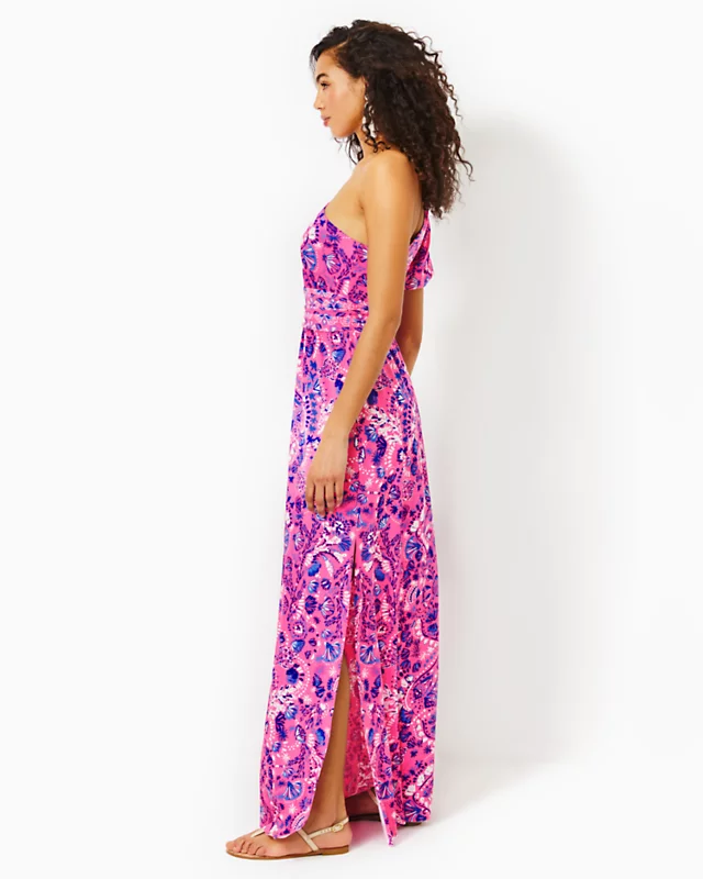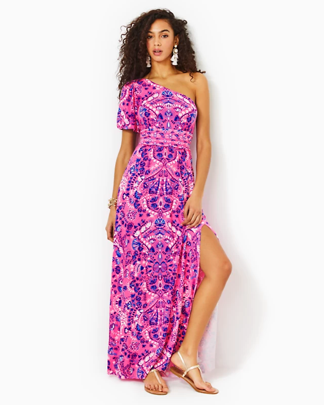 Our Solana Dress strikes the perfect balance between ease and elegance with soft jersey fabric in a masterpiece print. This flats-length maxi dress features a one-shoulder neckline with a short bubble sleeve, a ruched waistband, and a breezy side slit.