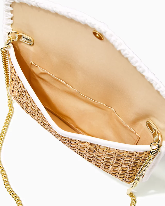 - Natural cane clutch with white whipstitched embroidery and detachable gold metal chain crossbody.